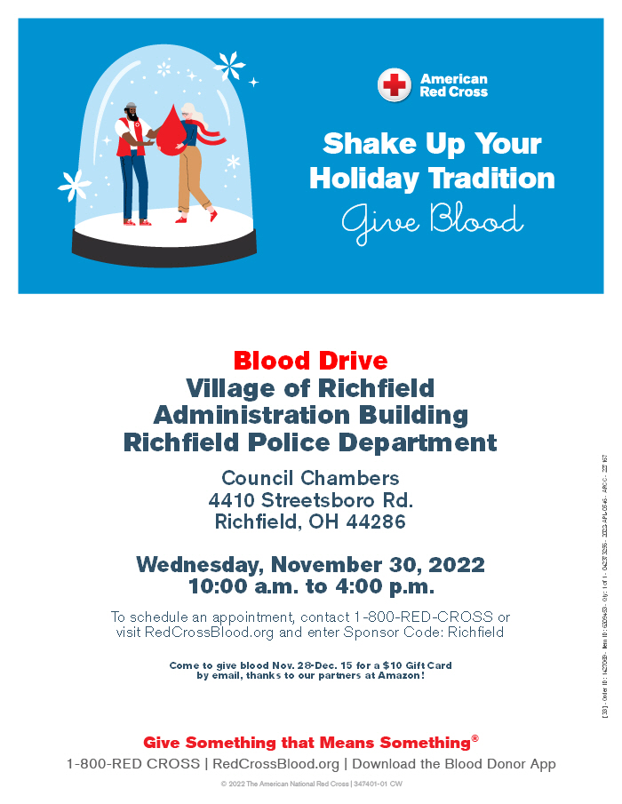 The American Red Cross will be at Village of Richfield Town Hall Administration Building on Wednesday, November 30, 2022 from 10:00 am to 4:00 pm.